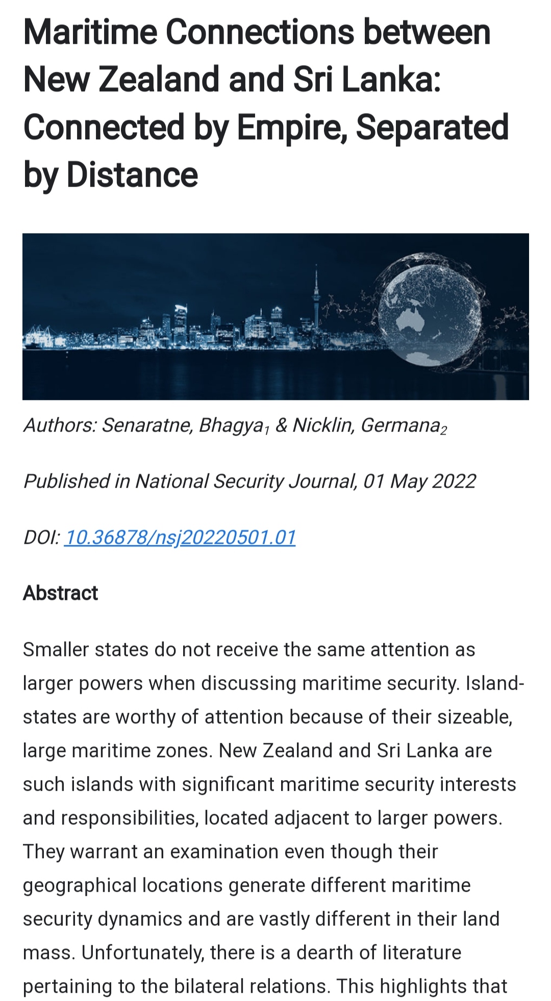 My latest article titled “Maritime Connections between New Zealand and Sri Lanka: Connected by Empire, Separated by Distance” a joint paper with Dr. Germana Nicklin from Massey University, New Zealand, which was published in the National Security Journal, can be accessed via: