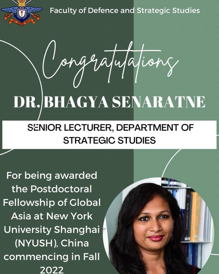 Dr. Bhagya Senaratne, Senior Lecturer, Department of Strategic Studies was offered the position of Postdoctoral Fellow of Global Asia at New York University Shanghai (NYUSH), China commencing in Fall 2022. She makes history in being the first academic from the Faculty of Defence & Strategic Studies and General Sir John Kotelawala Defence University (KDU) to proceed on a postdoctoral fellowship. Dr. Senaratne is also the only female academic at the Department of Strategic Studies to hold a doctorate. Her doctoral research was titled “An Analysis of Sri Lanka-China Bilateral Relations from 1994 to 2015”. During her Postdoctoral Fellowship, Dr. Senaratne will contribute to the NYU’s “Port Cities” project.